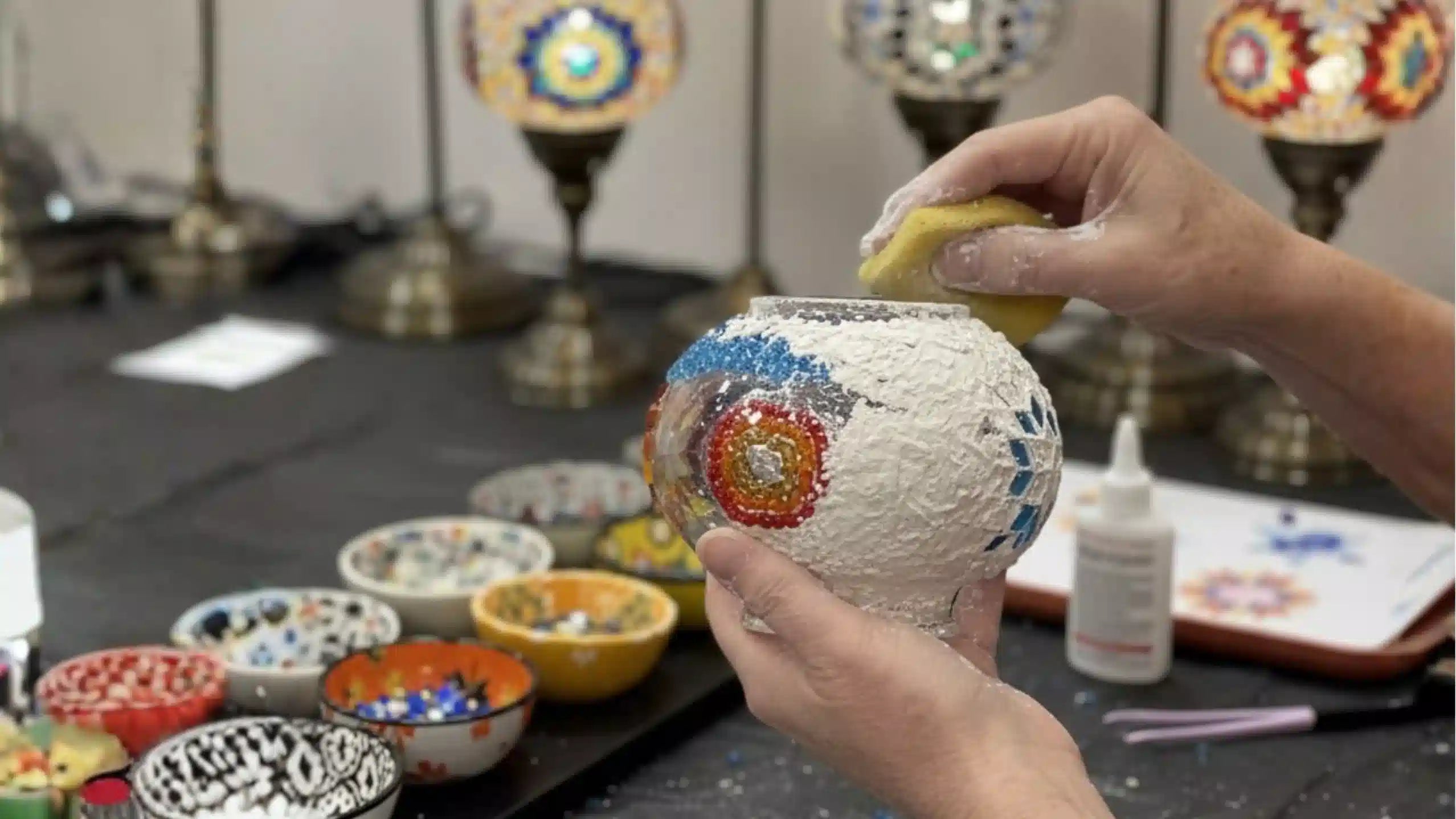 A standard Turkish mosaic lamp workshop usually lasts 2.5 hours. This precise time frame is carefully calculated to give you enough focused time to complete the most challenging and crucial part of the process: meticulously placing the tiny glass pieces (tesserae) onto your lamp globe.