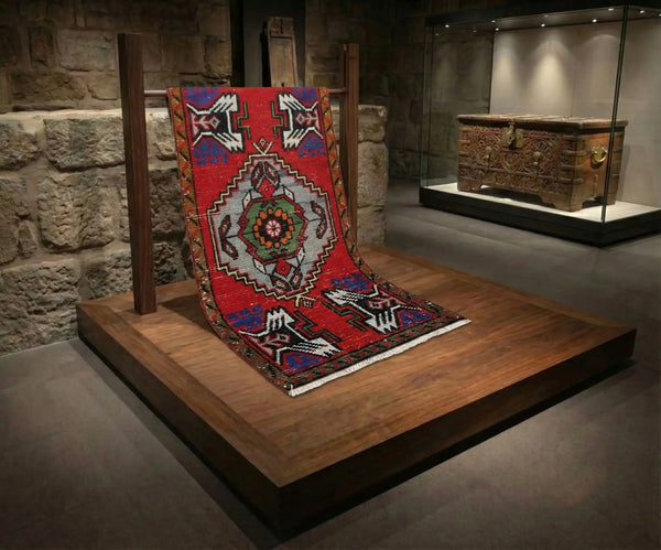 Woven in the Land of Beautiful Horses. Before it was a global travel icon, Cappadocia was a land of silence, stone, and master artisans. This exceptional rug, woven in the 1960s in the heart of Central Anatolia, captures the spirit of that magical geography. The vibrant, deep red background is not just a color; it represents the iron-rich volcanic soil of Cappadocia, formed over millennia by Mount Erciyes. The geometric medallions floating in the center echo the architectural marvel of the ancient cave dwellings and fairy chimneys.